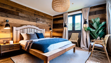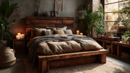 Experience the tranquility of a cozy bedroom featuring a rustic wooden bed adorned with soft textiles, lush plants, and warm lighting for a serene atmosphere.