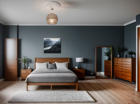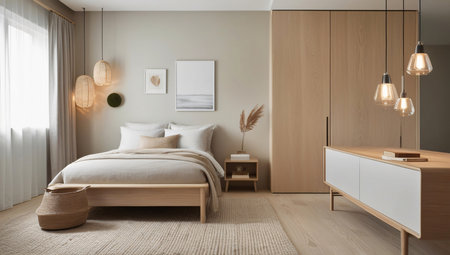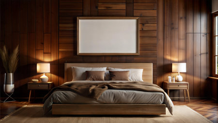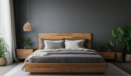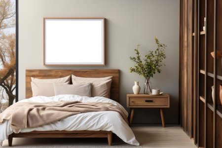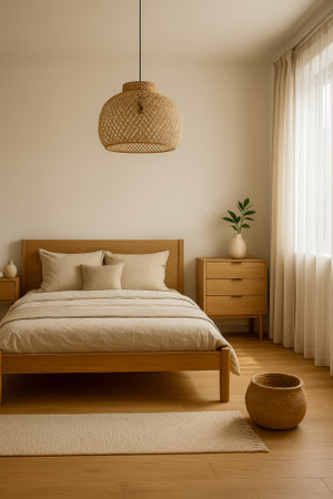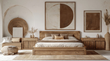 A serene bedroom interior featuring wooden bed frame, soft bedding, and decorative elements in earthy tones. space is enhanced by natural textures and minimalist decor, creating calming atmosphere