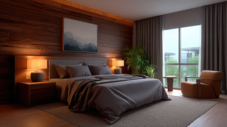 This image showcases a cozy bedroom with contemporary design elements, featuring soft lighting, wood accents, and lush greenery, creating a serene and inviting atmosphere.