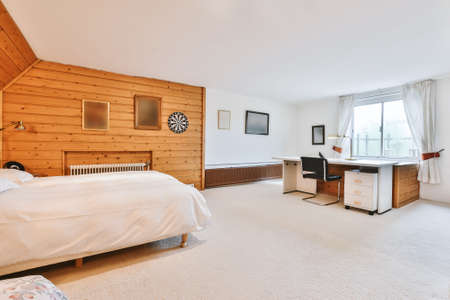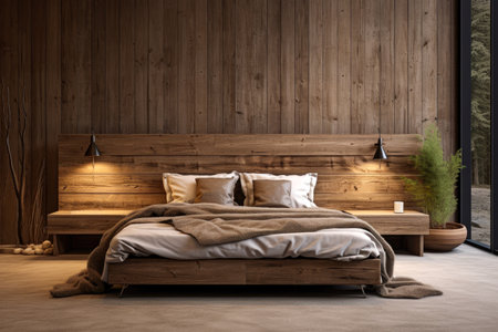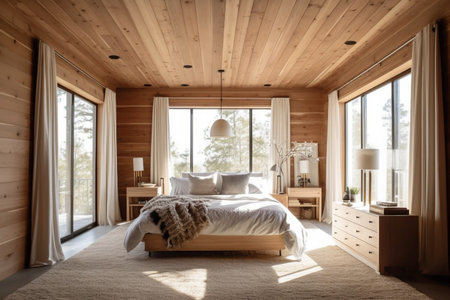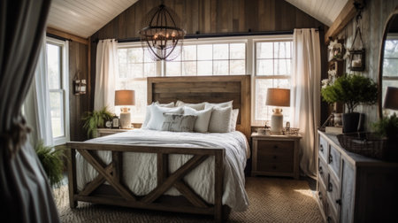 Farmhouse interior design of modern bedroom with wooden walls and Airy