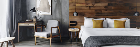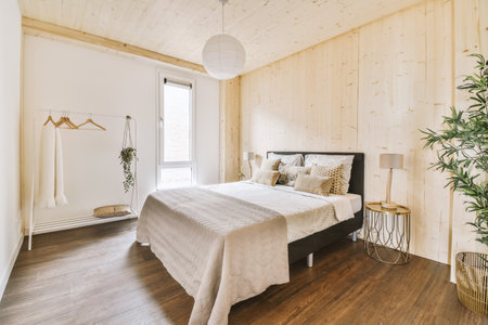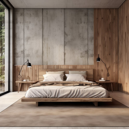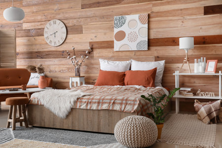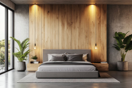 Boho interior design of cute modern bedroom with cute concrete and wooden paneling wall