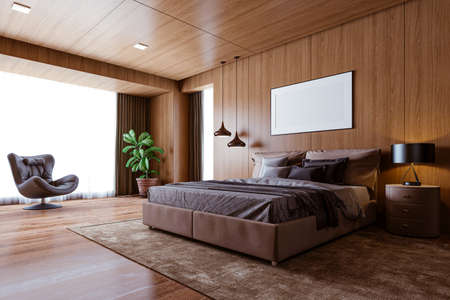 Interior of modern bedroom 3D rendering.There are wooden wall