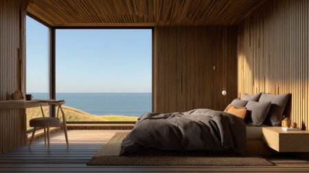 A contemporary bedroom showcases a bed, desk, and chair set against a vast ocean vista. The warm tones of natural wood paneling complement the soft, neutral bedding. Bright sunlight streams through the window, illuminating the space, suitable for architectural, lifestyle, or design concepts.