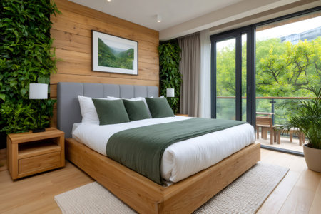 Comfortable and stylish bedroom with biophilic design, featuring a vertical garden and a balcony overlooking lush greenery