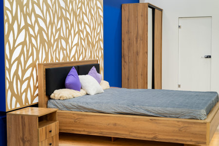 Interior of a modern bedroom with a double bed decorated with geometric shapes