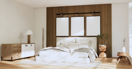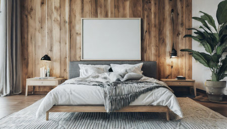 Blank white rustic bedroom poster template with rustic accents.Mockup blank for your design,illustrations,photos.Neutral color palette with warm lighting.