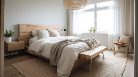 Interior design of Bedroom in Scandinavian style with Bed decorated with Wood, Linen, Wool material. Modern architecture. Generative AI AIG24.