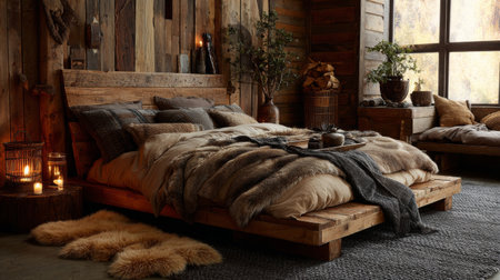 This image features a cozy rustic bedroom filled with wooden furniture, warm textiles, and natural decor that creates an inviting atmosphere perfect for relaxation.