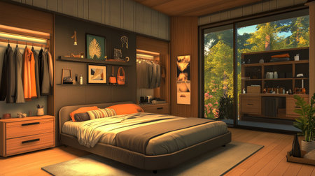 Modern home bedroom with a luxurious bed, a neatly arranged dressing space, and a panoramic window showcasing the outdoors.