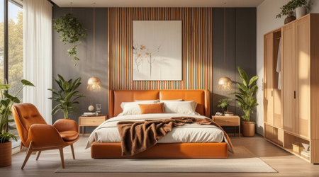 Interior of modern bedroom with orange bed, armchair and plants. 3d render