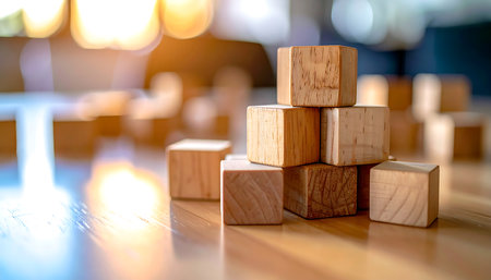 A captivating arrangement of wooden blocks creates a striking visual on a modern workspace, emphasizing creativity and natural materials in design and architecture.