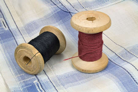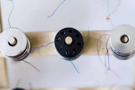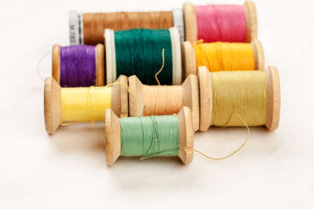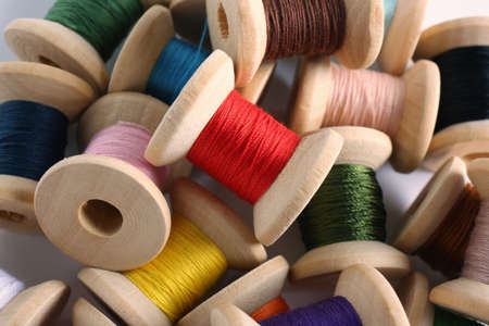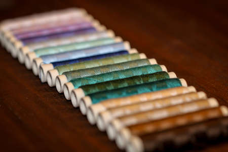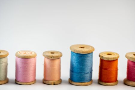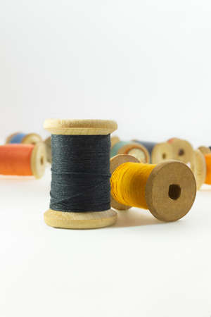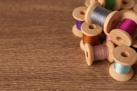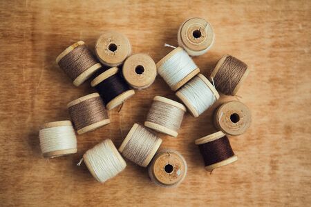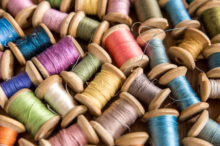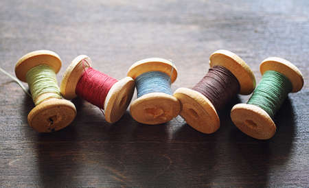Colorful threads for sewing. Different threads on wooden vintage reels.
