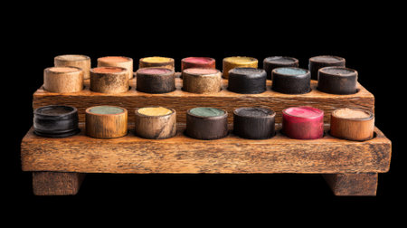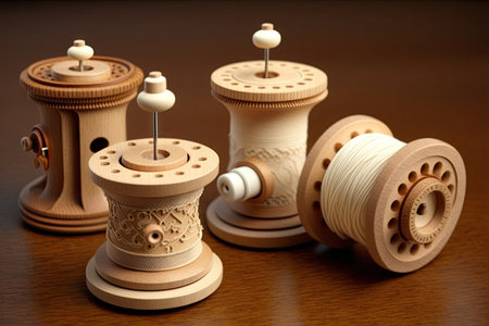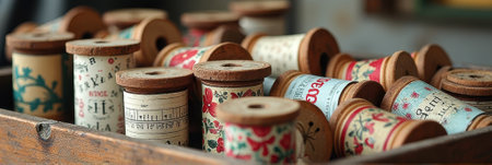 Vintage wooden thread spools in a rustic box with various patterns. That the image is generated using AI.