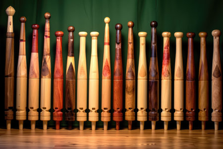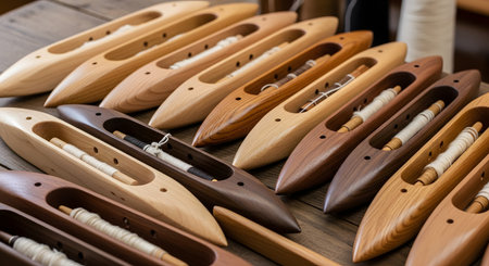 A beautiful collection of traditional wooden weaving shuttles is neatly arranged on a rustic wood table. The shuttles, varying in wood type from light to dark, are loaded with bobbins of thread, ready for use on a loom. This image represents the tools of the weaving trade, craftsmanship, and textile arts.