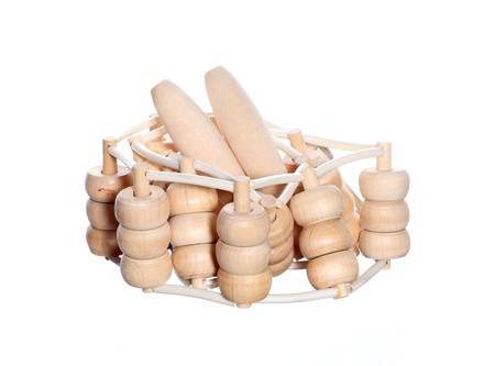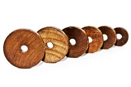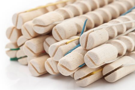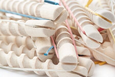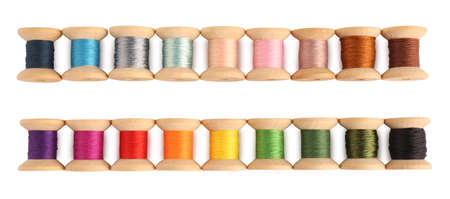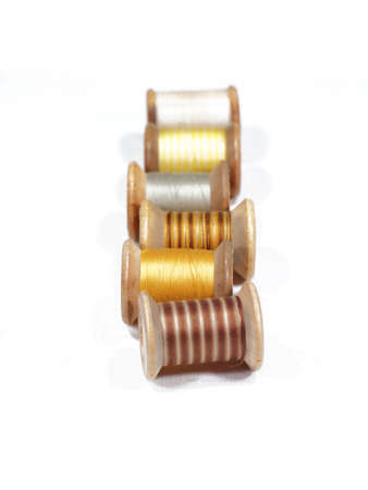 group wood spool of sewing thread isolated on white. Close-up macro shot.