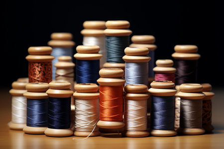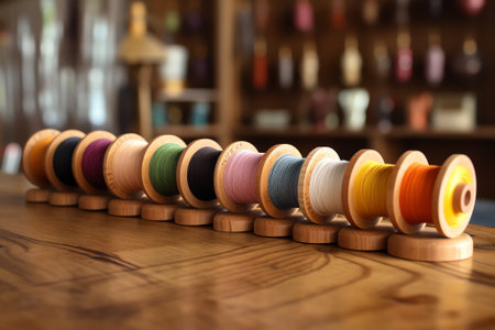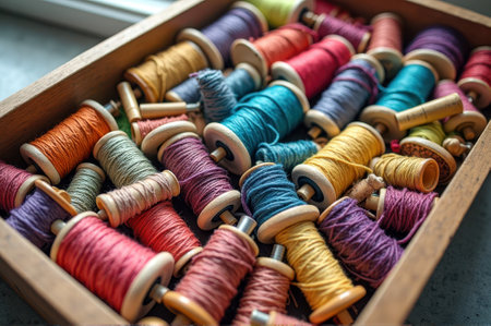 Colorful assortment of thread spools in wooden box showcasing textile creativity. That the image is generated using AI.