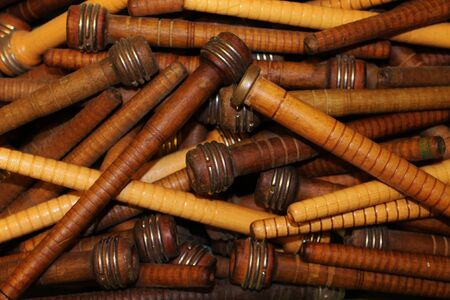 Bobbins traditionally manufactured for wrappng thread, twine or string around great background for traditiona craftl manufacturing processes