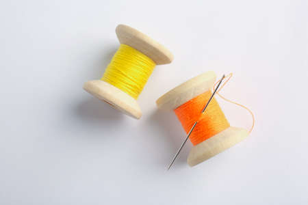 Sewing needle and colorful sewing thread on wooden spool on isolated white background