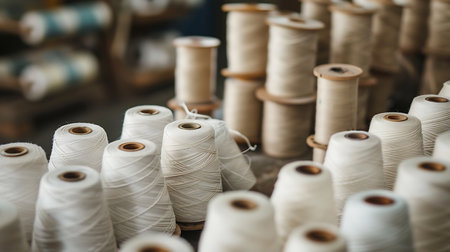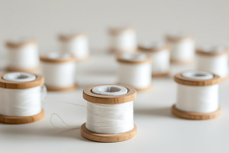 A captivating close-up of spools of yellow thread placed on a rustic wooden table, highlighting the essence of vintage sewing materials and craftsmanship.