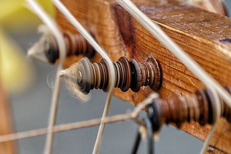 colored woolen threads on an old loom, Traditional Yarn in Canada.