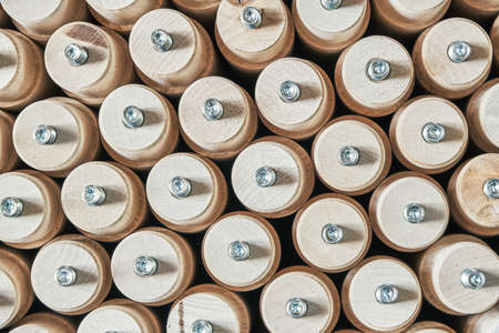 Lathe wooden legs of solid birch with built-in screw pin stacked vertically in a cardboard box extreme closeup upper view