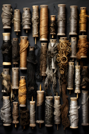 Close up Rolls of Vintage Colorful Threads. Clothes Repair, Black Dark Background. Sewing work