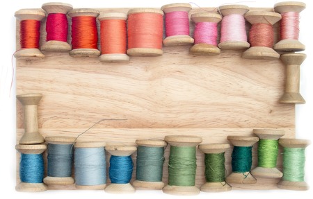 color thread for sewing on spools on a wooden background, handcraft, top view