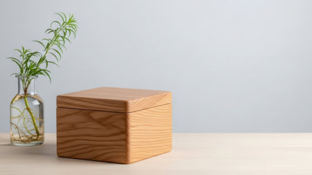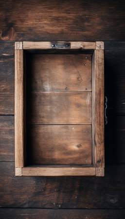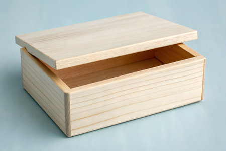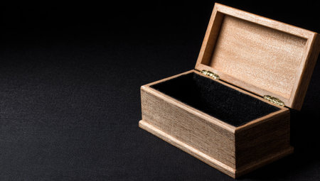 An open wooden box is presented against a stark black backdrop, creating a high-contrast visual. The box features a natural wood grain texture with a dark interior. The composition is simple, emphasizing the object. It could be used for product presentations, packaging mockups, or adding a touch of elegance to various design projects.