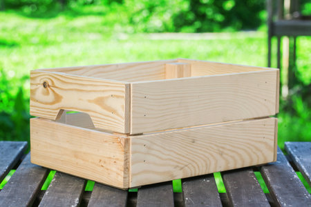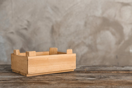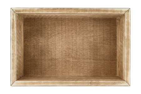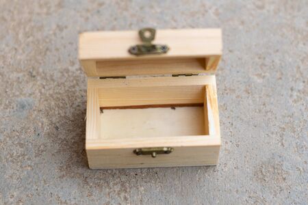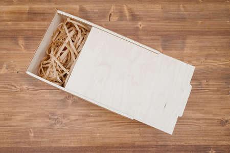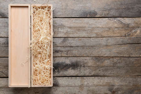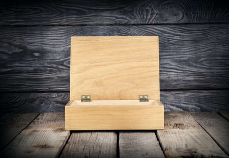 Wooden empty box on wooden background. Top view.Empty wooden box product material - plywood. wood case place for goods in the store for small things.