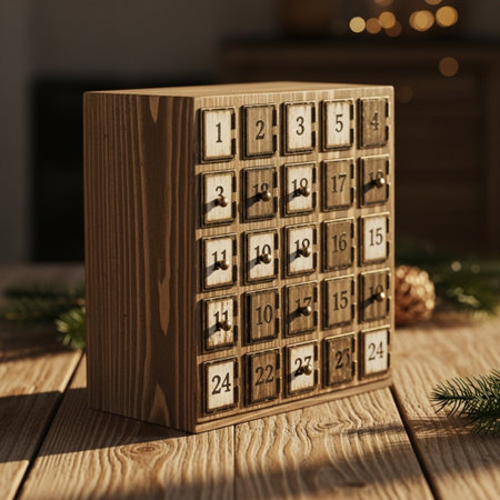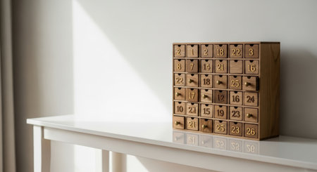 A wooden advent calendar with gold numbers sits on a white tabletop, reflecting the numbers. Soft, natural light illuminates the scene, creating a calm atmosphere.
