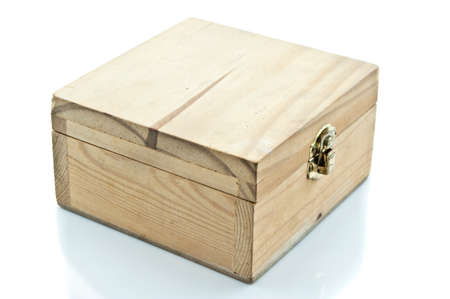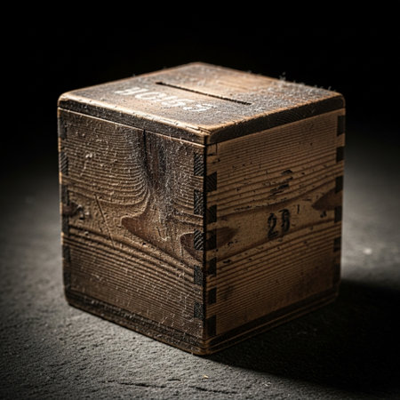 Editorial still life photograph of a small, historical wooden ballot box. The antique container, sym