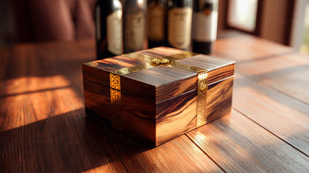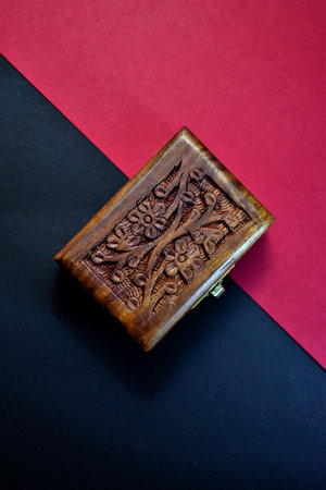 wooden box with rings,wooden box resting on a wooden table, black and white style