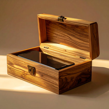A modern smartphone rests inside an open, handcrafted wooden box, bathed in warm sunlight.