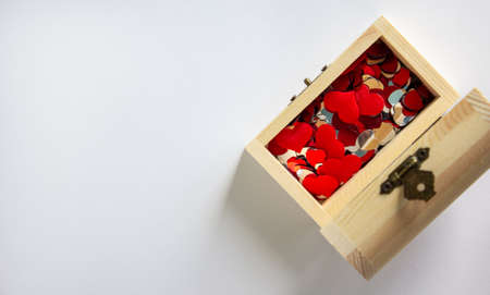 Image of many small heart in wooden chest. Beautiful white background, copy space.