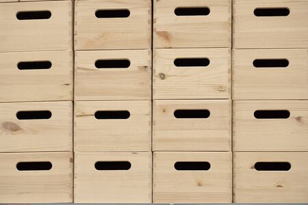 shelf with drawers made of natural light wood with knots and pattern with sawn handles for carrying. warehouse of handmade products