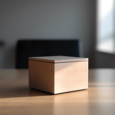 A minimalist arrangement of natural wooden blocks stacked on a rustic wooden table, illuminated by warm sunlight creating a cozy atmosphere.
