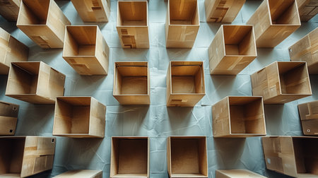 Large-scale image of a wall featuring a multitude of small, square wooden boxes, arranged in a visually appealing design. The boxes are various shades of wood tones and white, creating a complex pattern. The image appears to be a close-up view, showcasing the textures and detailed shapes of the different boxes.