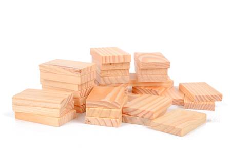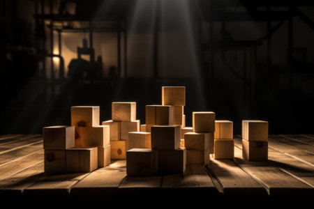 A minimalist arrangement of natural wooden blocks stacked on a rustic wooden table, illuminated by warm sunlight creating a cozy atmosphere.