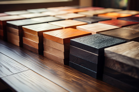 Assortment of parquet or laminate floor samples in natural colors. Wood laminate floor square samples, vinyl tile. Oak wooden background, Selecting exterior colors, Samples, Generative AI.
