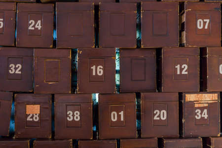 Angled side view of card index drawers lit by a bright light in a dark room. One drawer opened.