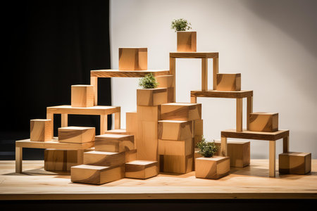 Abstract wooden blocks floating in a corridor, perspective view, minimalistic design