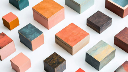 This image features an array of colorful geometric boxes laid out in an artistic arrangement on a neutral surface, perfect for design, craft, and decoration ideas.