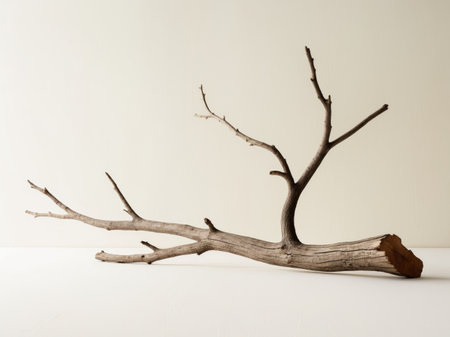 Natural wooden branches on a white, textured wall, creating a tranquil and artistic backdrop