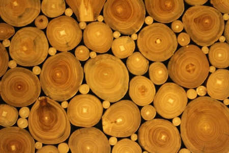 Close-up of freshly cut logs, showing the rings and grains of natural wood material