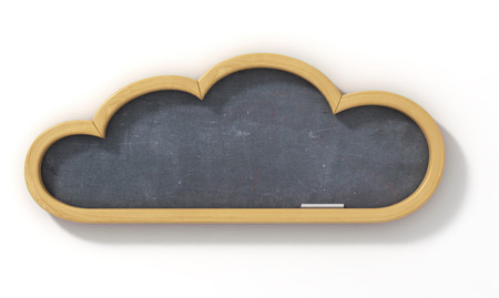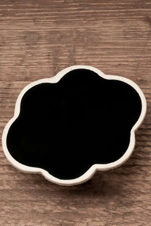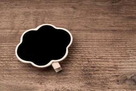 cloud shaped chalkboard on a wooden surface with copy space