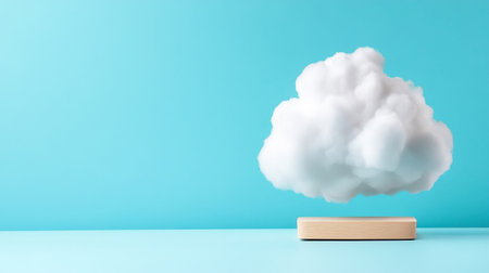 A fluffy cloud floating above a wooden stand against a vibrant blue backdrop, creating a whimsical and minimalist scene.