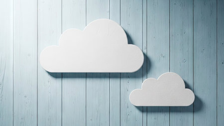 Cloud computing concept with white paper clouds on wooden background. 3D Rendering