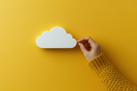 Holding a white cloud in the hand, empty copy space for text, yellow background, communication and marketing concept, being connected, networking