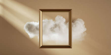 3d render. Golden vertical frame and white cloud isolated on beige background. Modern minimal art gallery concept