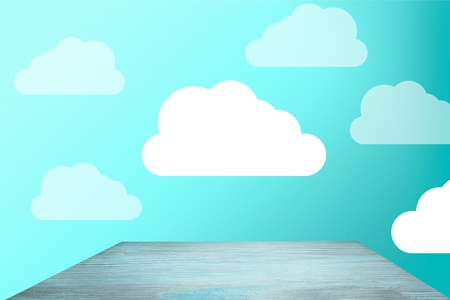 The image shows clouds of clay imitating the clouds and the concept of technological clouding over wooden background as if it Were an illustration